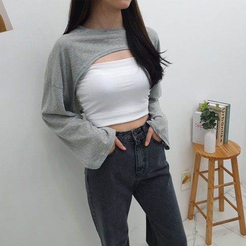 여성 간절기 레이어드 크롭 탑 볼레로 긴팔 티셔츠