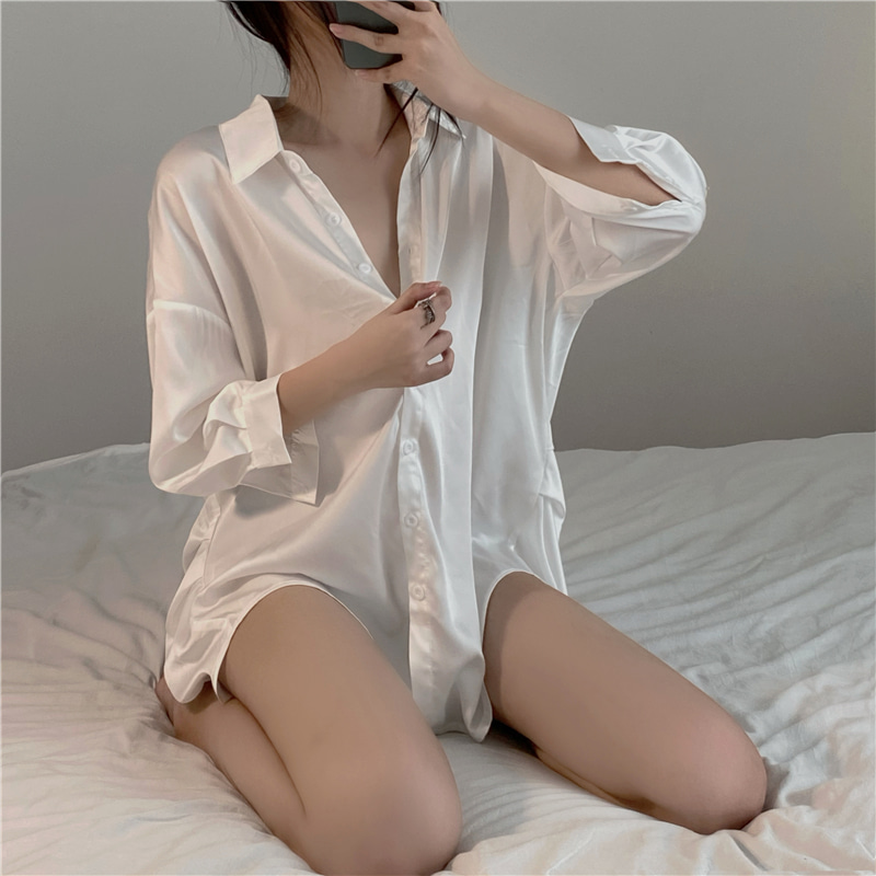 오버핏 남친 셔츠 아이스 실크 폴로 카라 중간 길이 잠옷/홈웨어/파자마/파티룩/호캉스룩/촬영룩
