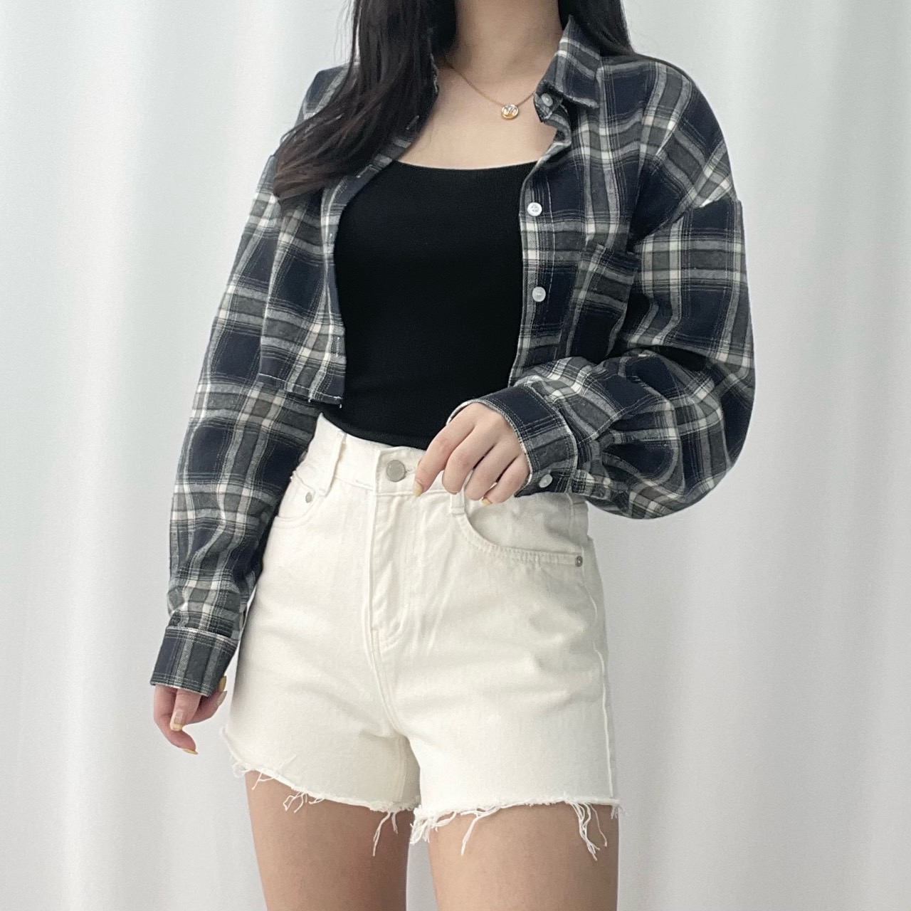여성 여자 남색 네이비 톡톡한 오버핏 짧은 체크 크롭 남방 셔츠