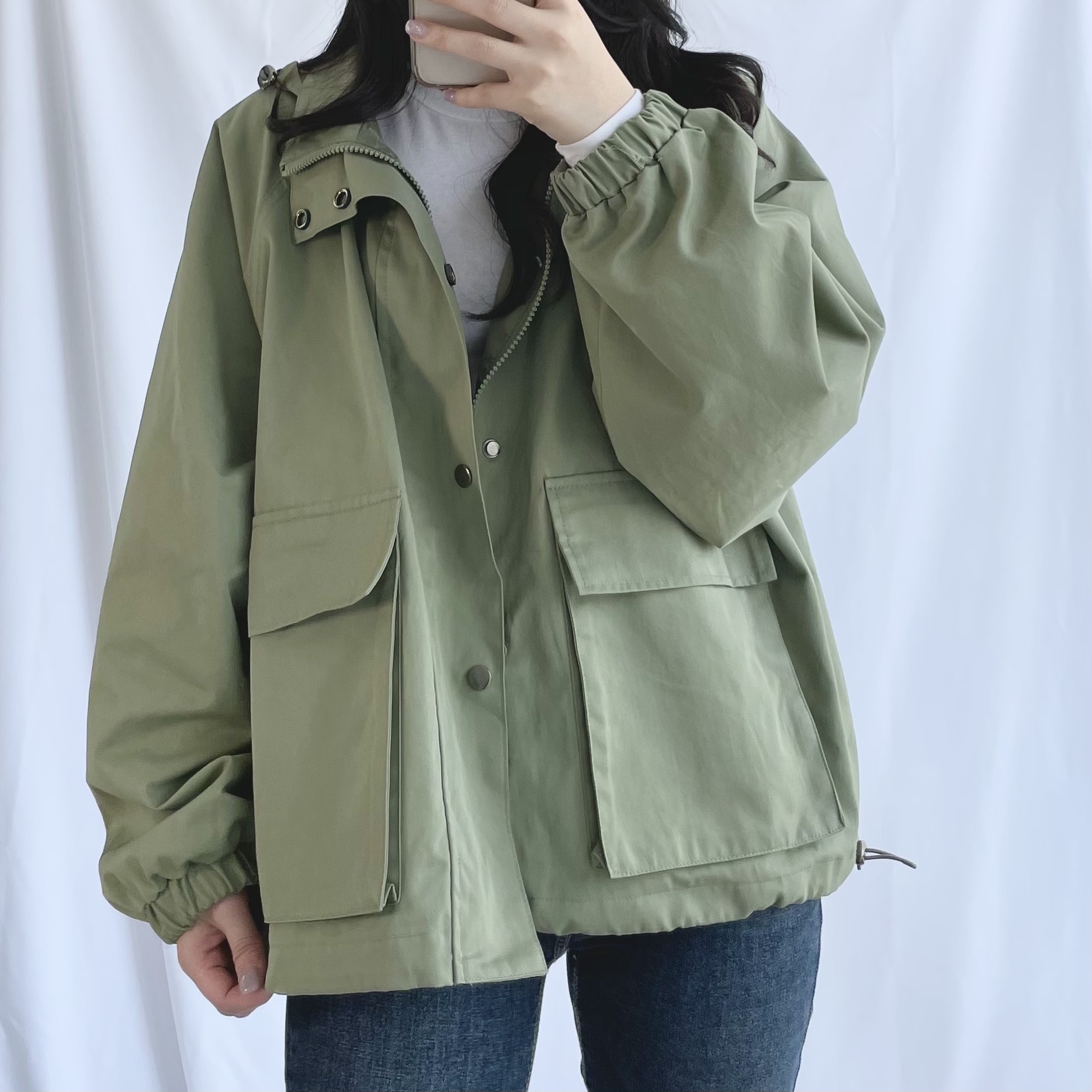여성 여자 봄 가을 간절기 카키 크림 오버핏 후드 야상 자켓 사파리 점퍼 스트링 밀리터리