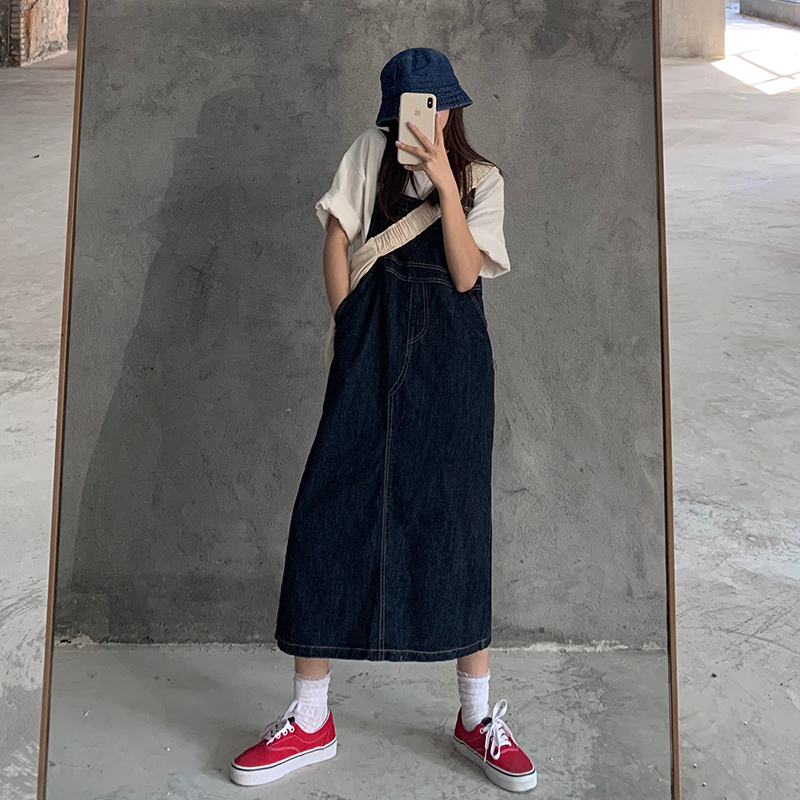 공항패션 공항룩 하이틴 영캐주얼 진청 포켓 레이어드 여름 멜빵원피스