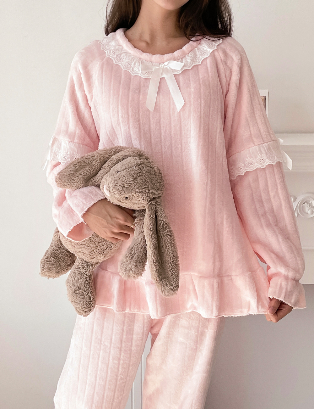 🤍밍크 수면🤍 레이스 카라 수면 상의+하의 세트 투피스 극세사 잠옷 홈웨어 이지웨어