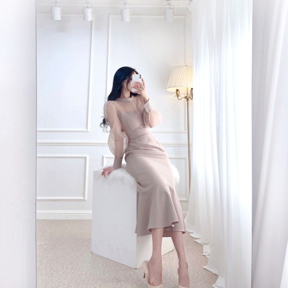 [빠른배송💗/기획특가] 르엘르 오간자 다이아넥 시스루 쉬폰 롱 머메이드 원피스 (good quality - 베이지,인디핑크,블랙 올드머니 봄 가을 겨울 하객룩 결혼식 원피스 소개팅 상견례 모임룩 연말룩 파티룩)