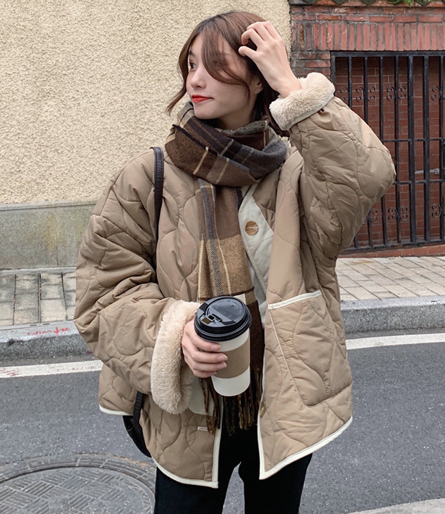 베이지/브라운 퍼안감 누빔 숏 패딩