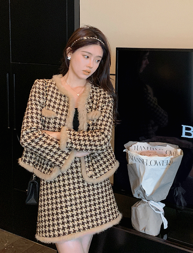 [겨울신상/하객룩/연말룩] 트위드투피스 퍼자켓 트위드치마 하운드 트위드자켓 겨울신상 세트 셋업