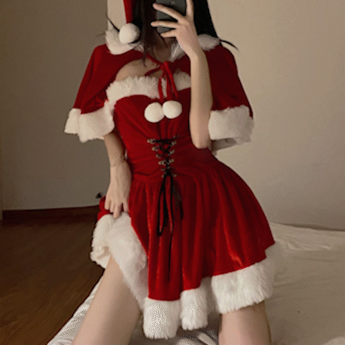 [당일출고/크리스마스/코스프레] 섹시 산타걸 망토 빅사이즈 투피스 모자 세트 레드 오프숄더 A라인 벨벳 미니 겨울원피스 연말룩 파티룩 홀리데이 이벤트 옷 산타걸원피스