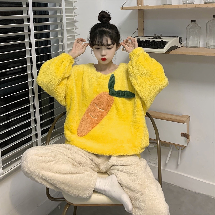 귀여운 노랑 당근 도톰 라운드넥 겨울 벨벳 수면 바지 잠옷 투피스세트 홈웨어