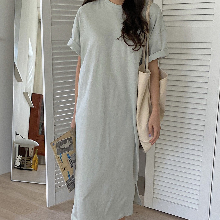 집에서 입는 편안한 홈웨어 꾸안꾸 등하원 마실룩 라운드 박시 면 반팔 롱 티셔츠 원피스