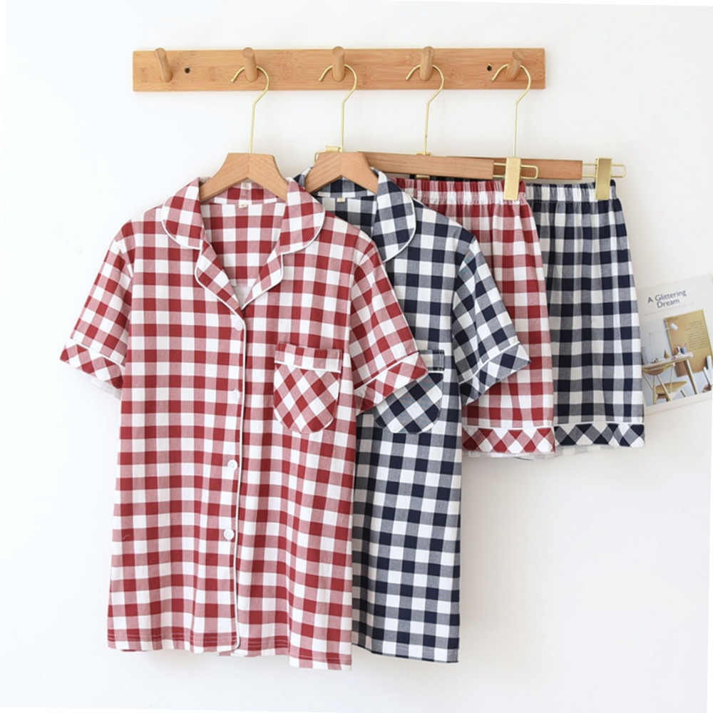 4컬러 순면 깅엄 체크 반팔 여름 커플 잠옷 파자마 홈웨어