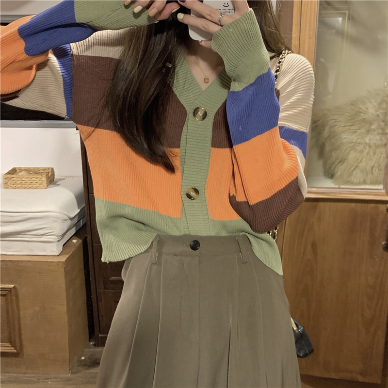 그린 브라운 오렌지 블루 톤온톤 무드 니트 브이넥 가디건 스웨터