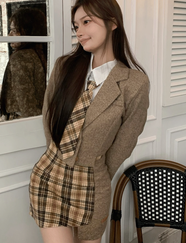 [코스프레/스쿨룩/교복세트] 체크 교복치마+넥타이+울자켓 겨울아우터 롯데월드 코디 셋업 파티룩 (셔츠 미포함)