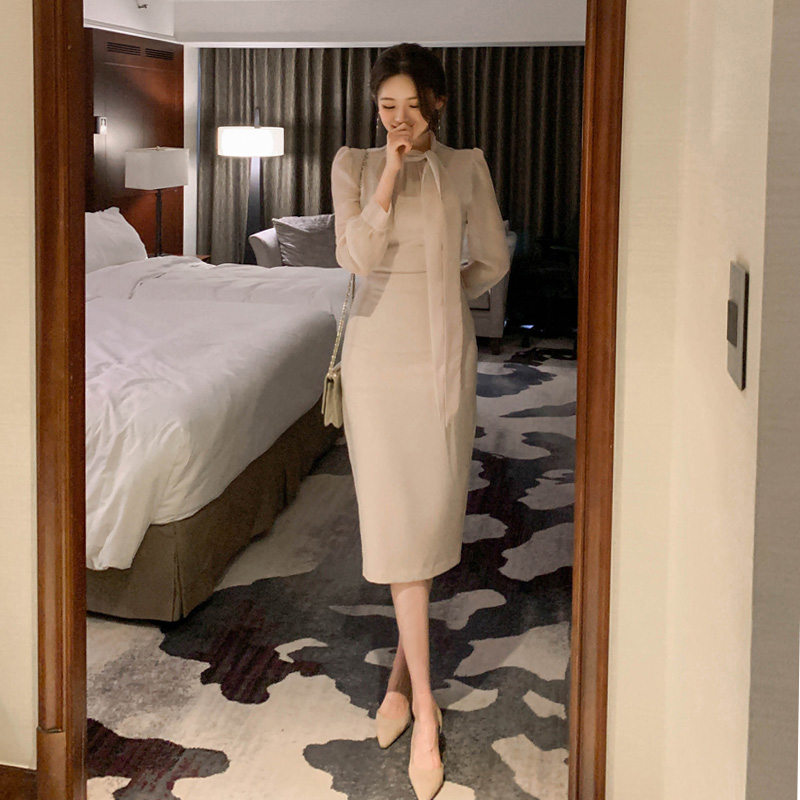 주문폭주 [단독진행] [완벽라인] 타이넥 쉬폰 배색 H라인 슬림핏 미디 원피스 연말원피스 연말룩 겨울원피스 나들이룩,데이트룩,출근룩,하객룩,하객룩원피스 op13079