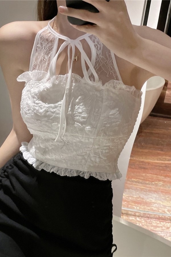 허쉬 레이스 홀터넥 밴딩 튜브 탑