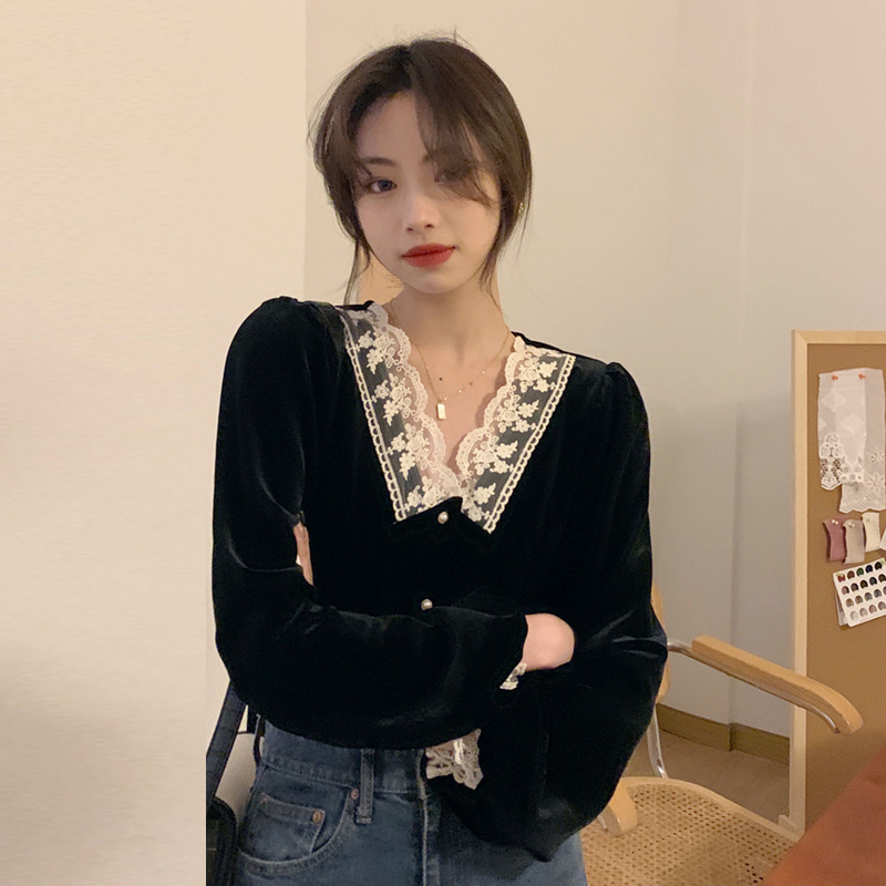 벨벳 레이스 상의 프렌치 스타일 빈티지 레깅스 긴 팔 브이넥 셔츠 유니크 디자인 러블리 여친룩 여행룩 촬영룩