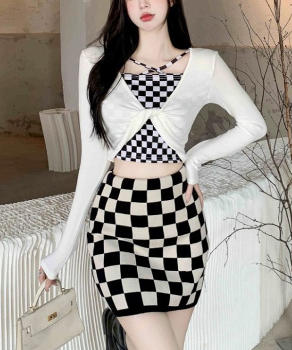 무료배송 [코디세트 탑+스커트] 체크보드 투피스룩(화이트탑+스커트,블랙탑+스커트)