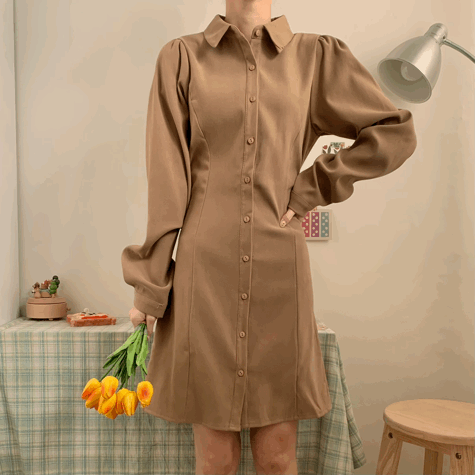 부드러운 소재 개비 단추 핀턱 라인 뒷 리본 카라 셔츠 미니 원피스