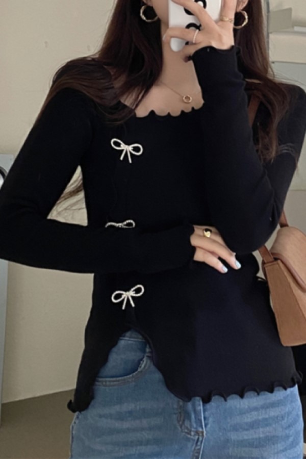 엘라 큐빅 리본 꿈틀이 라운드넥 긴소매 롱슬리브 니트 탑