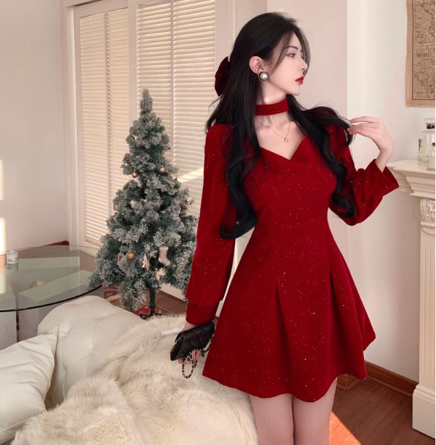 [당일배송] 연말연시룩 크리스마스 성탄절 파티 [블랙/레드] 펄 벨벳 원피스