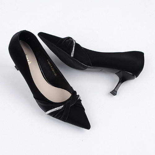 블랙&베이지 리본 보석디테일 뾰족코 몰드굽 스틸레토힐 (6.5cm)