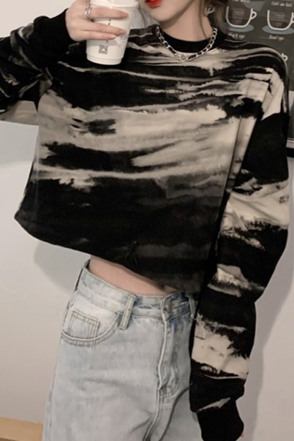 블랙 얼룩 라운드넥 긴소매 롱슬리브 티셔츠