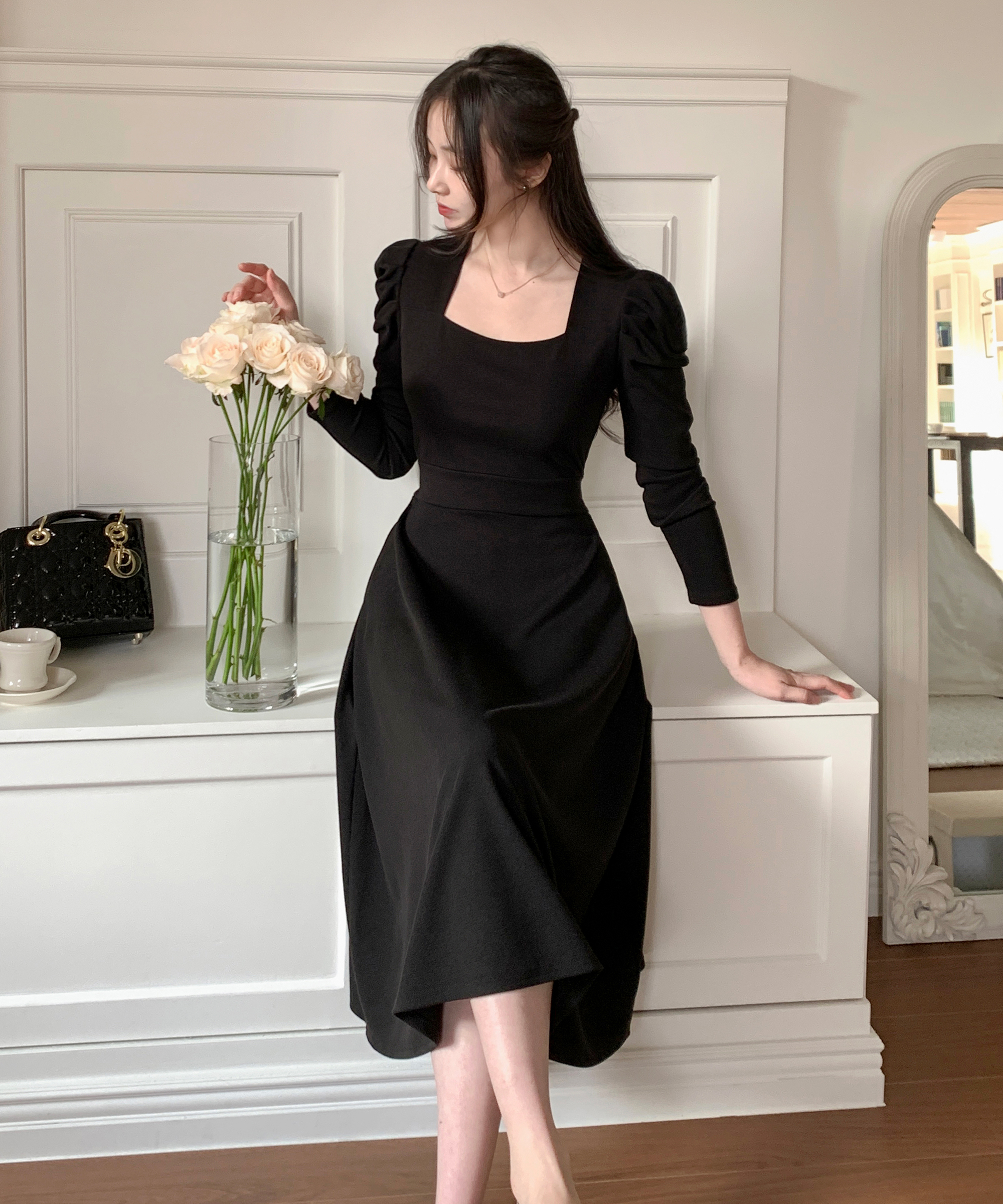 클링 봄 가을 하객룩 벚꽃룩 퍼프 스퀘어 긴팔 A라인 플레어 롱원피스