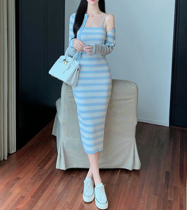 22FEB054 40대여성쇼핑몰 스트라이프 롱원피스 가디건 투피스 코디세트