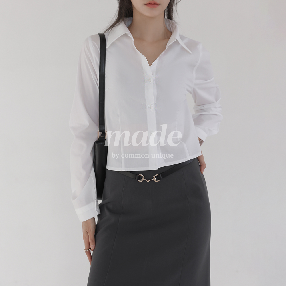 [단독] [주현영 착용/MADE] 하디 스판 다트 크롭 셔츠 (겨울/가을/이너셔츠/레이어드/슬림핏/핀턱/격식룩/하객룩/출근룩/프레피룩)