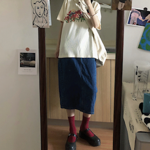 [복고풍/투피스셋업]레트로 꽃무늬 반팔 티셔츠 데님 청치마 미디 롱스커트 봄신상 복고패션 원피스 세트