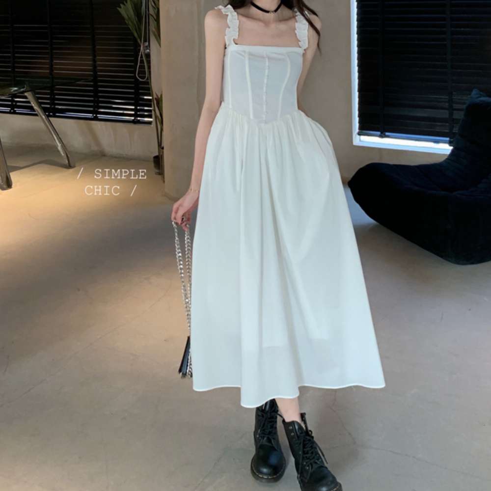 화이트 나시 심플 민소매 하이웨스트 롱 원피스 드레스 J28