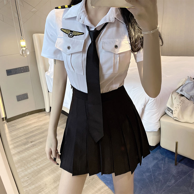 [교복] 롯데월드 코스프레 프레프룩 와펜 반팔 셔츠 + 넥타이 + 플리츠 미니 스커트 졸업/친구촬영/앨범촬영