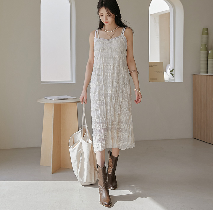 미노이 링클 레이스 슬리브리스 원피스 (여름 신상/뷔스티에/나시/슬림/여리 핏/레이어드/휴가/휴양지 룩)