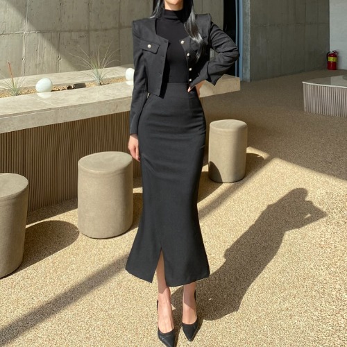 엘렌 자켓 슬릿 스커트 셋업 ( 하객룩 패드 머메이드 롱 트임 크롭 숏 포켓 결혼식 세트 투피스 )