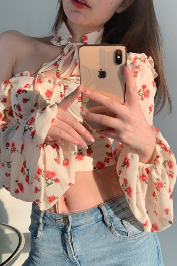 아린 플라워 쉬폰 오프숄더 긴소매 롱슬리브 크롭 블라우스 탑