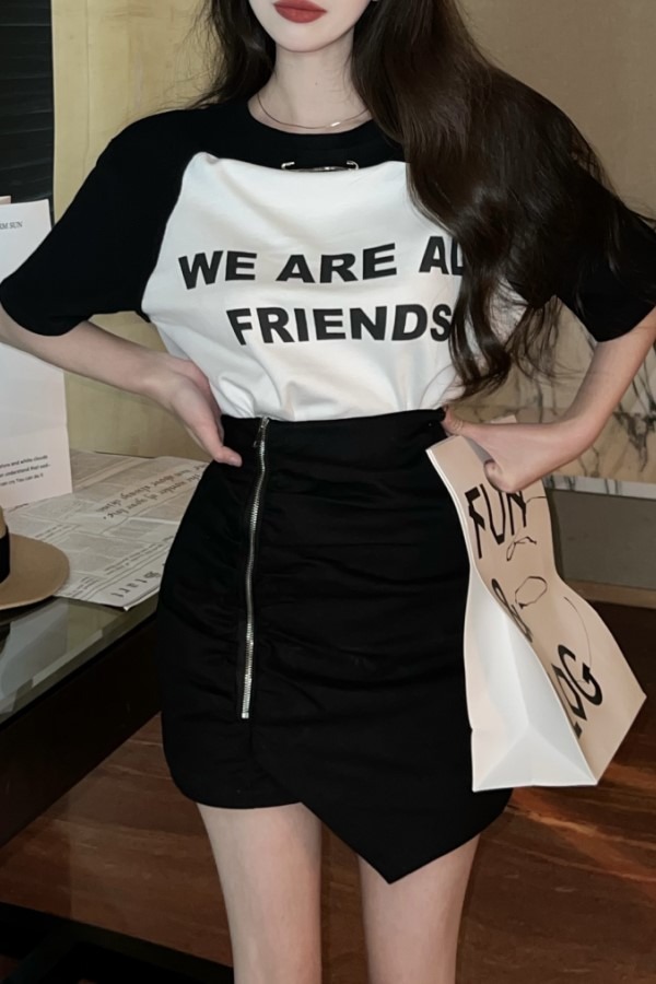 set 옷핀 라운드넥 반팔 레터링 티셔츠 집업 셔링 스커트 투피스 세트