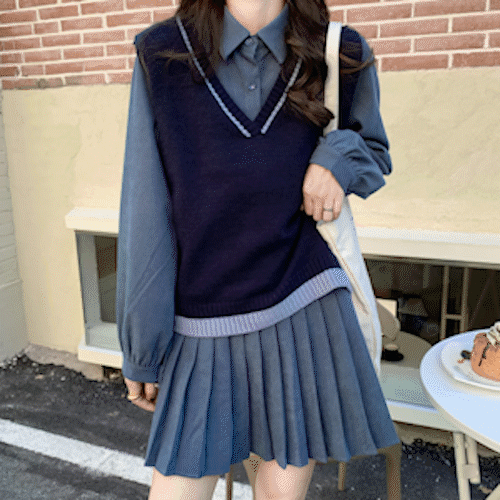 [50%할인/당일출고/봄신상/투피스]브이넥 오버핏 배색 니트 조끼 베스트 레이어드 미디 플리츠 테니스 셔츠 숏 원피스 스쿨룩 세트