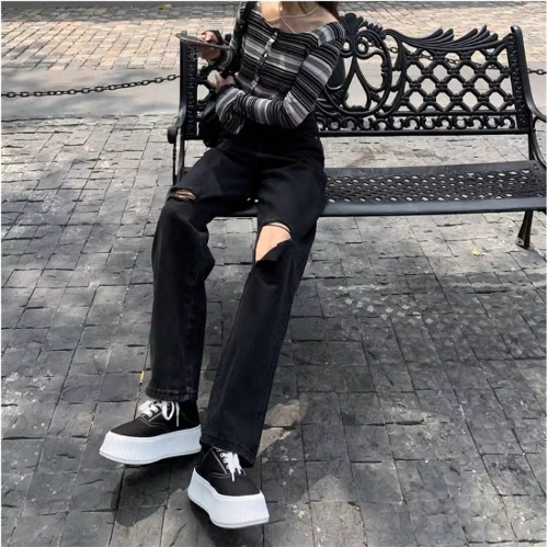 무릎 찢청 일자 청바지 데님 롤업 스트레이트 키작녀 빅사이즈 롱 블랙진