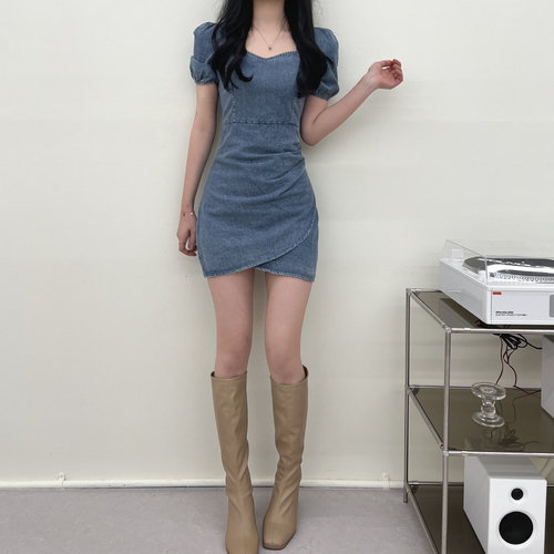 하트네크라인 뷔스티에 데님 청 미니 원피스