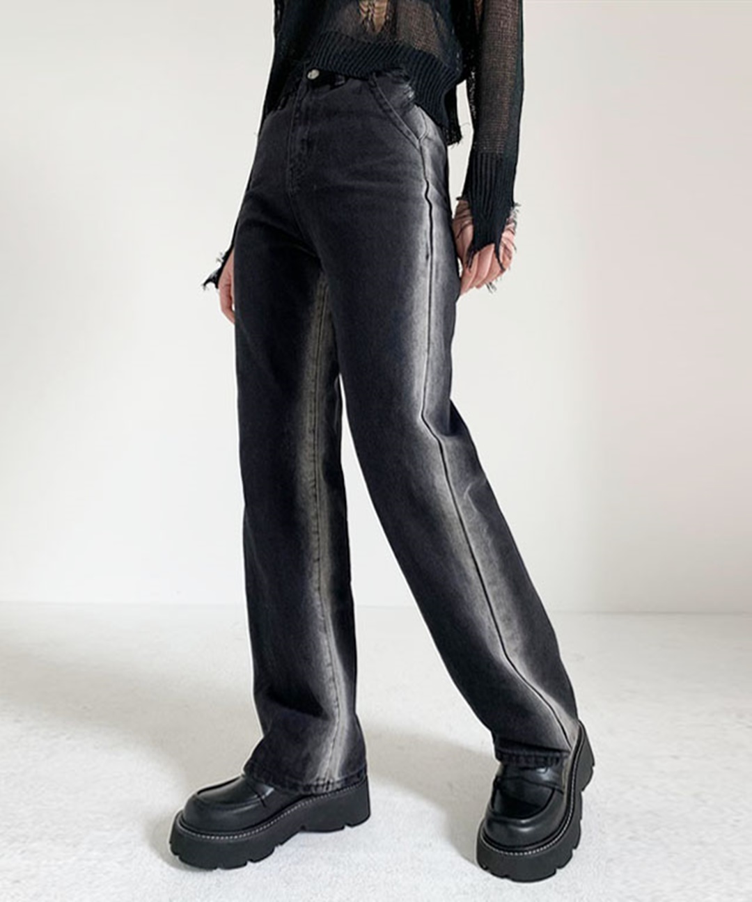 사이드라인 배색워싱 블랙데님팬츠 와이드핏 블랙진 일자청바지