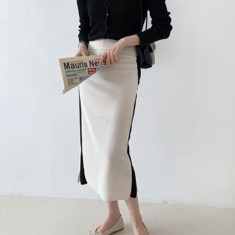 여자 옆 배색 줄 옆트임 치마 일자핏 스판 롱스커트