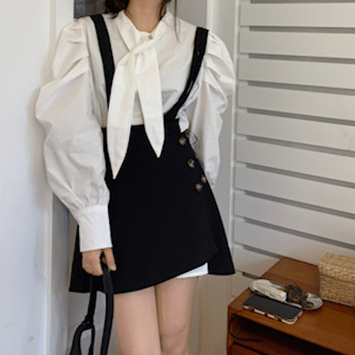 오버핏 핀턱 퍼프 셔링 화이트 빅사이즈 셔츠 서스펜더 멜빵 언발 미니 스커트 정장 투피스 하객룩 데이트룩 오피스 세트