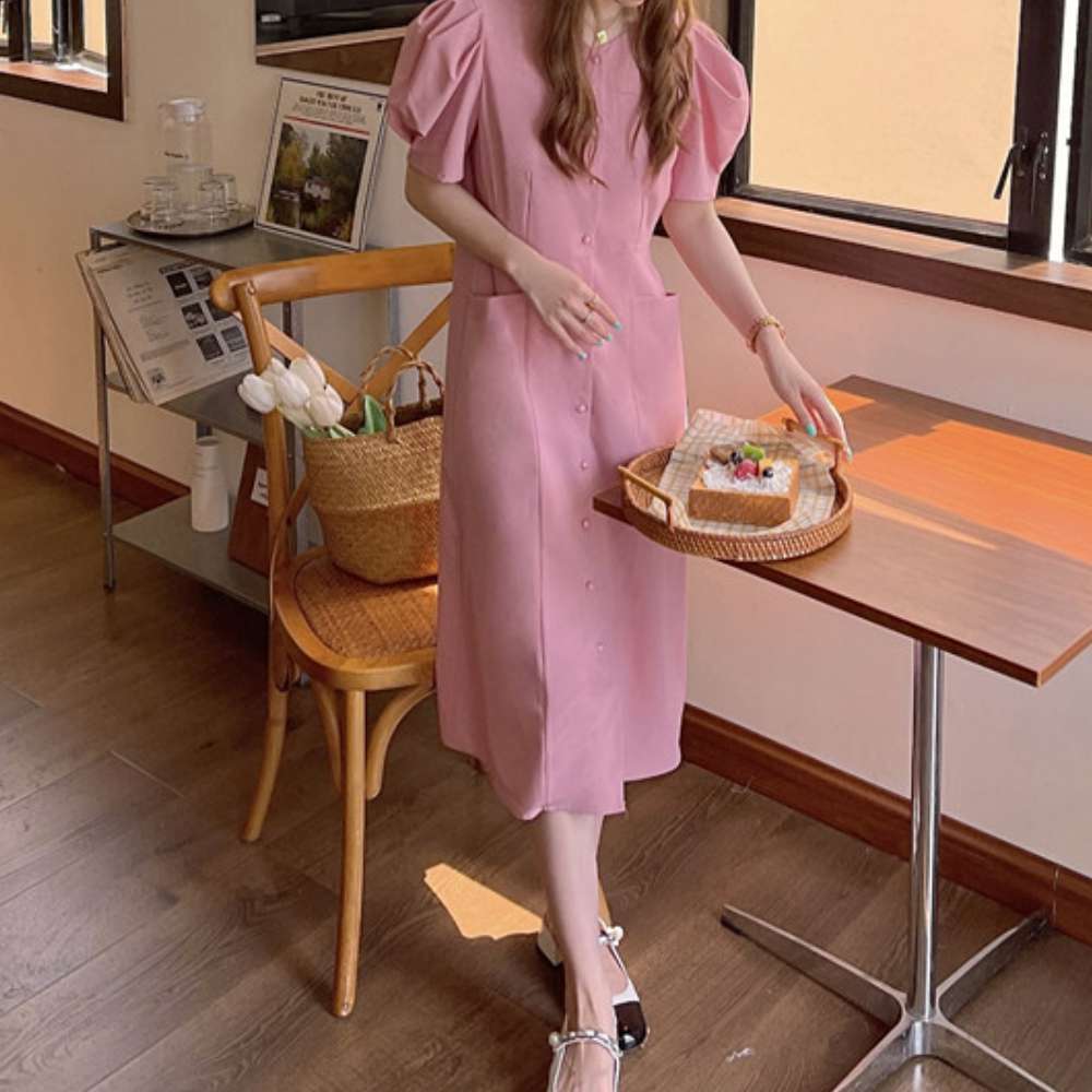 핑크 심플 어깨 퍼프 데일리룩 롱 원피스 드레스 J30