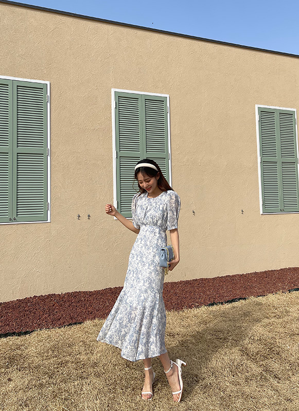 레얼 플라워 반팔 셔링 롱 원피스