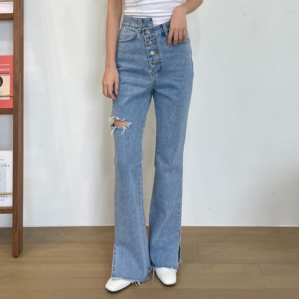 [M만] 린다 트임 부츠컷 데님 팬츠 (봄,여름,가을,겨울,4계절,긴,청,바지,언발,란스,언밸런스,하이,웨이스트,웨스트,유니크,버튼,단추,중청,양,디스트로이드,찢,어진,커팅,컷팅,데미지)