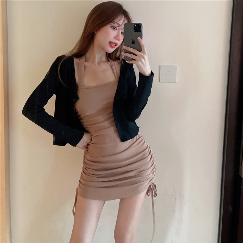 슬림 홀터넥 셔링 면 원피스 / 블랙 가디건