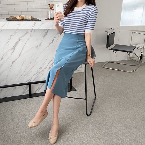 펜슬스커트 77 빅사이즈 가을 하이웨스트 밴딩 스판 머메이드 슬릿 H라인 롱 옆트임 스커트 (12color)