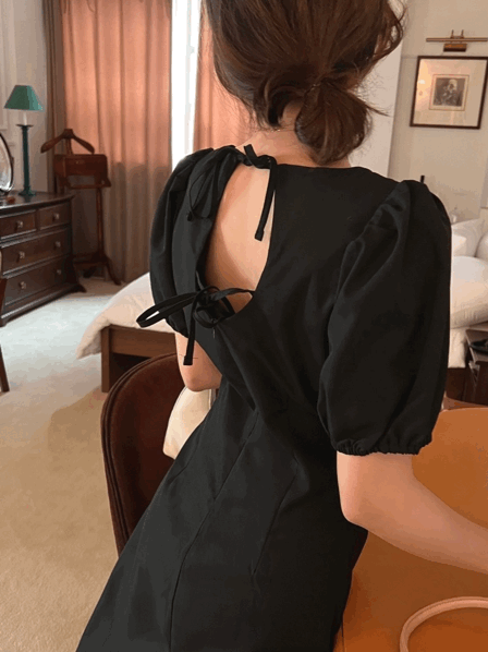 [MADE] 3col 블랙슈가 스퀘어넥 퍼프 뒷리본 반팔 롱 원피스