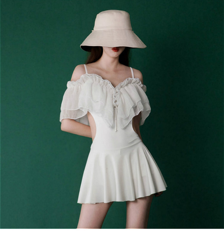 풀파티 화이트 빅프릴 오프숄더 원피스 수영복