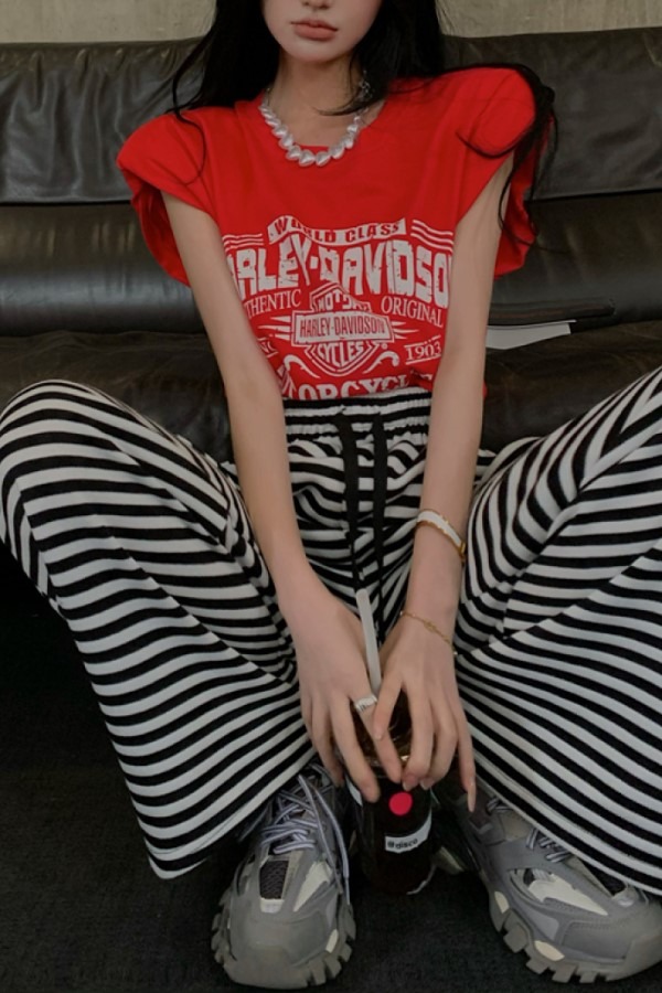 set 어깨뽕 캡 소매 레터링 라운드넥 레드 티셔츠 단가라 데미지 팬츠 투피스 세트