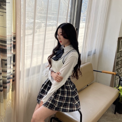 [당일발송] 프릴 블라우스 크롭 니트 조끼 테니스 스커트 세트 (2size)