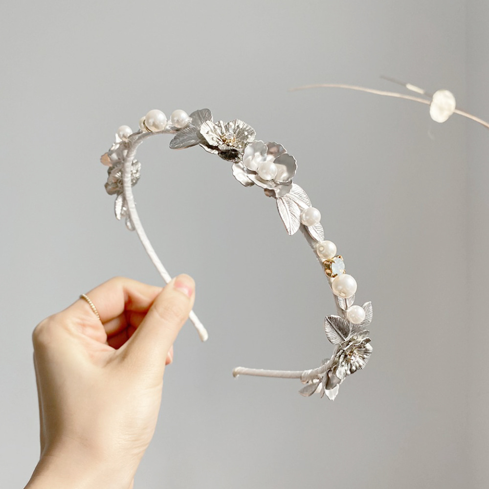 플러브 셀프웨딩 실버 입체 플라워 진주알 얇은 헤어밴드